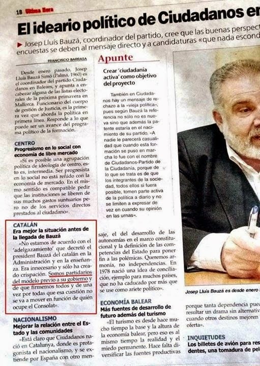 · No conozco a Josep Lluís Bauzà. Sólo sé que es el flamante coordinador de Ciudadanos en Baleares y que, al decir de los medios, va a encabezar con toda probabilidad alguna de las principales listas que el partido presentará en las elecciones del 24 de mayo. Y sé algo más, algo fundamental para mí: que él y su partido consideran que las medidas tomadas en esta legislatura por el Gobierno del Partido Popular en relación con el uso del catalán en la Administración y la enseñanza —o sea, la rebaja del nivel de exigencia del conocimiento del catalán en determinados sectores administrativos y la puesta en práctica del decreto de trilingüismo, más conocido por TIL— eran innecesarias y no han creado más que crispación. De ahí que sean partidarios de su retirada y de firmar con las demás fuerzas políticas «y de una vez por todas que esa cuestión no se va a mover en función de quién ocupe el Consolat [sede del Gobierno Balear]».